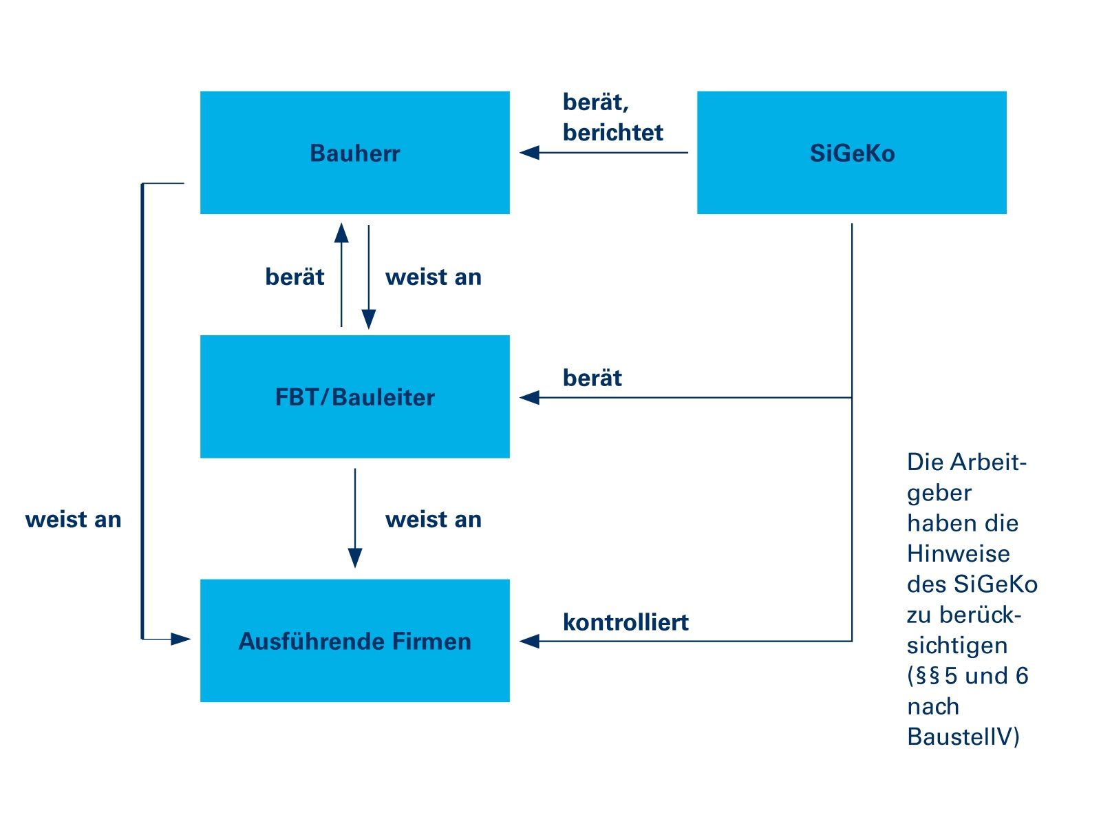 Bauherren sind dabei in der Regel auf die Fachkunde und Erfahrung geeigneter Koordinatoren angewiesen und können Ihre Pflichten an den Sicherheits- und Gesundheitsschutzkoordinator (SiGeKo) übertragen. Durch Berücksichtigung des Gesundheitsschutzes schon bei der Planung und durch die Koordinierung der Schutzmaßnahmen soll das Sicherheitsniveau für die Beschäftigten erhöht und Arbeitsunfälle vermieden werden.